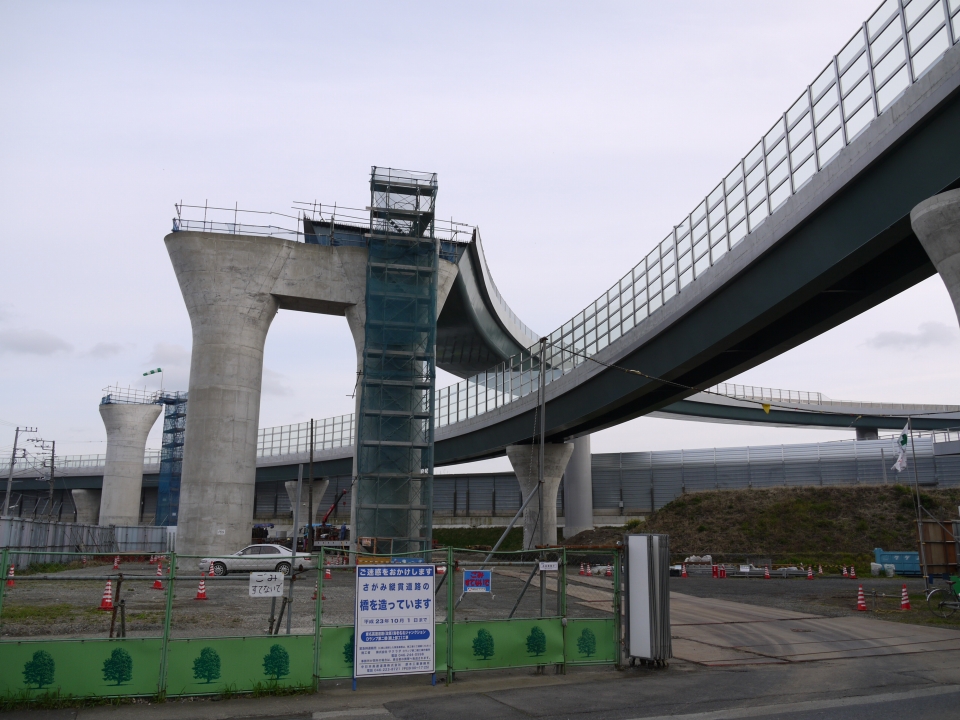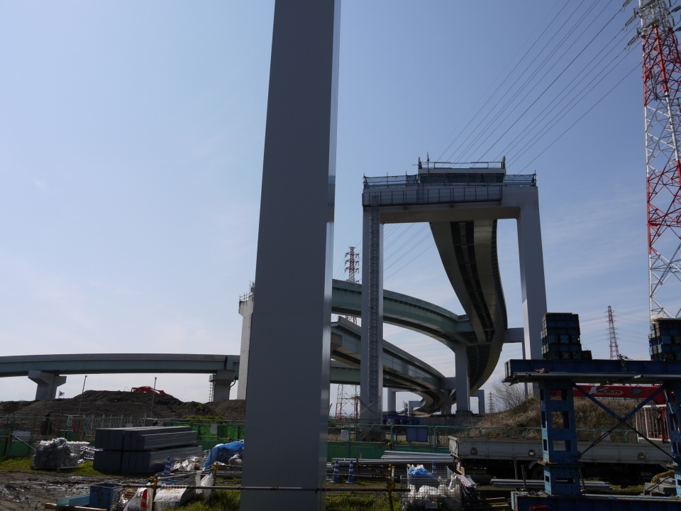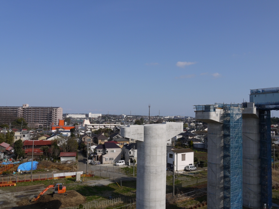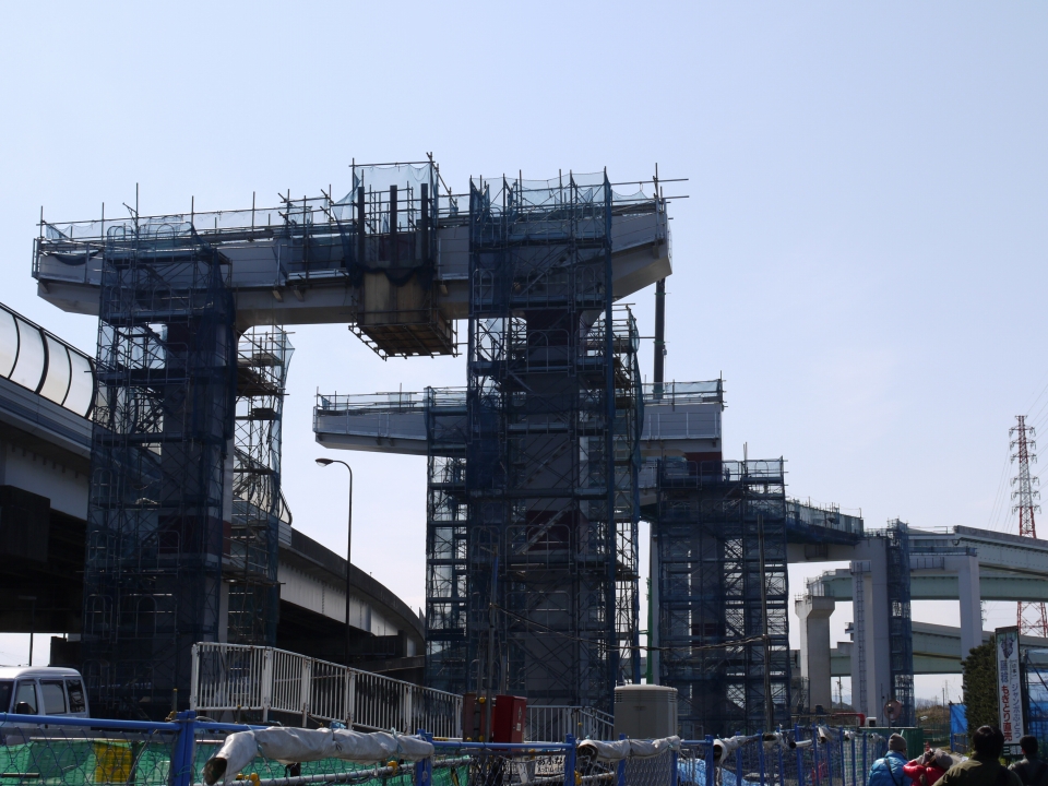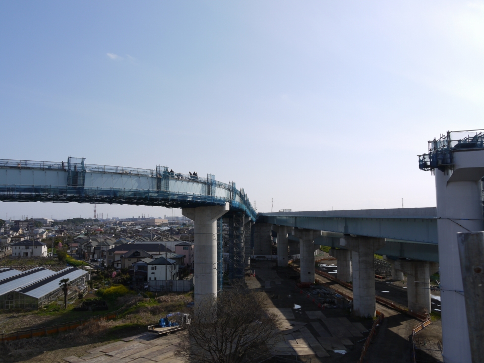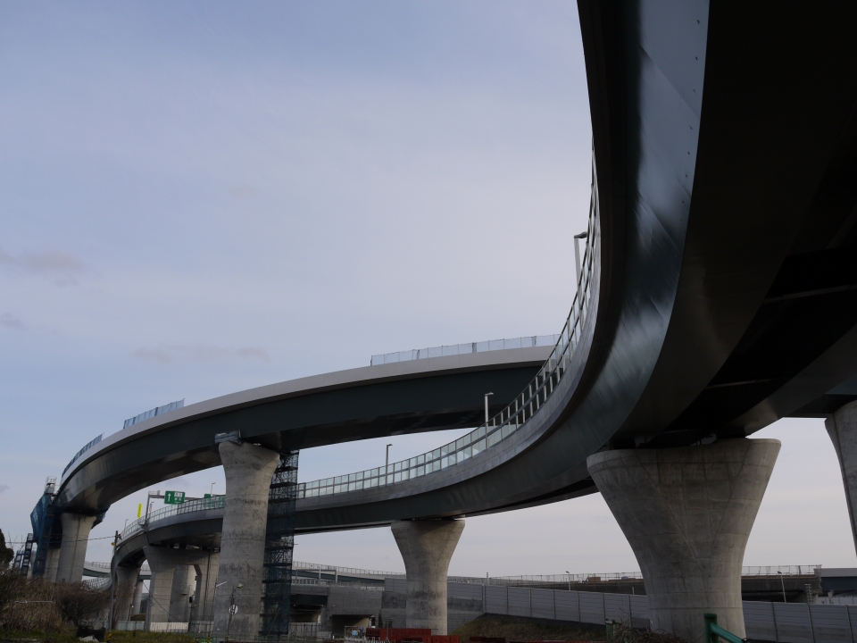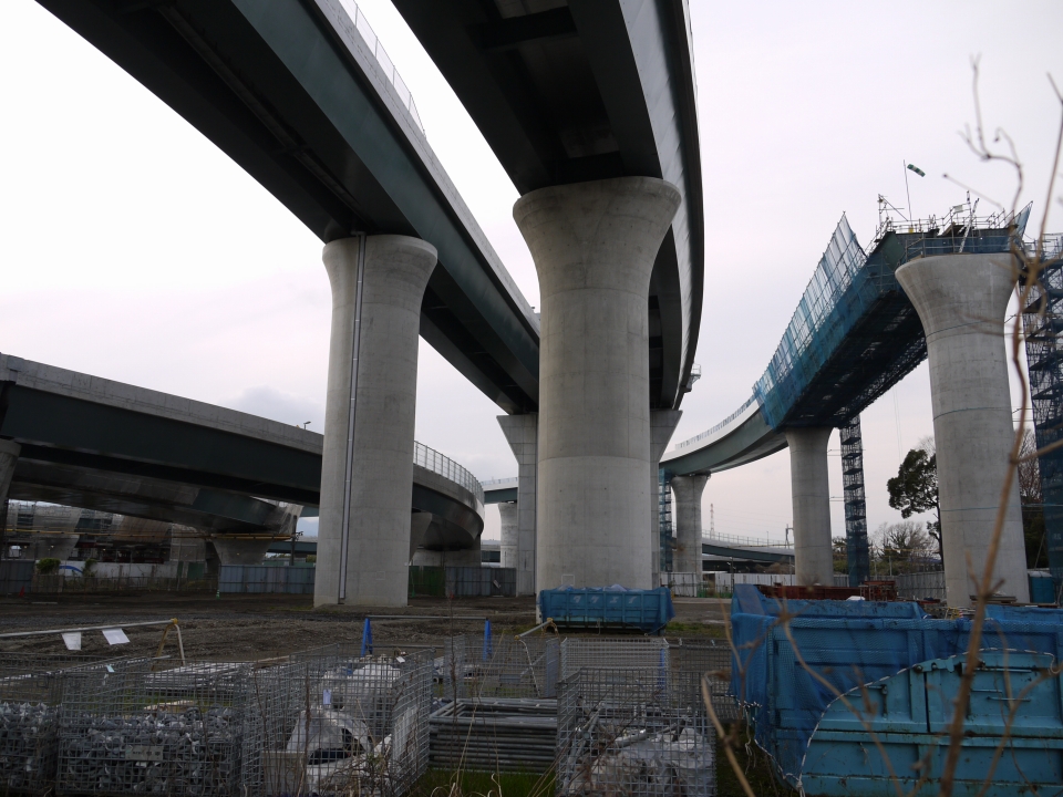 今までは門型やT字型の橋脚でしたが、この橋脚デザインはあまり見ないですね。